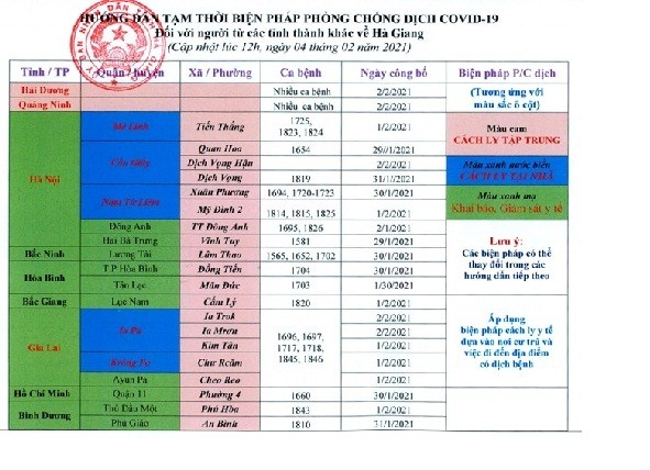 - Yêu cầu người đi từ các tỉnh về địa phương: TP Hà Nội, Bắc Giang, Hòa Bình, Bắc Ninh, Gia Lai, Bình Dương, TP Hồ Chí Minh không thuộc địa bàn có ca bệnh phải thực hiện khai báo y tế, giám sát y tế chặt chẽ.